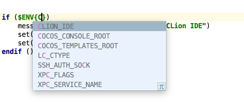 若您需要检测项目中的 CMake 命令是否是从 CLion 运行的(在这种情况下请设置 特别的变量/路径或执行额外脚本),那么请使用 CLION_IDE 环境变量。 为了让您更方便地找到它,CLion 提供了环境变量自动补全功能。