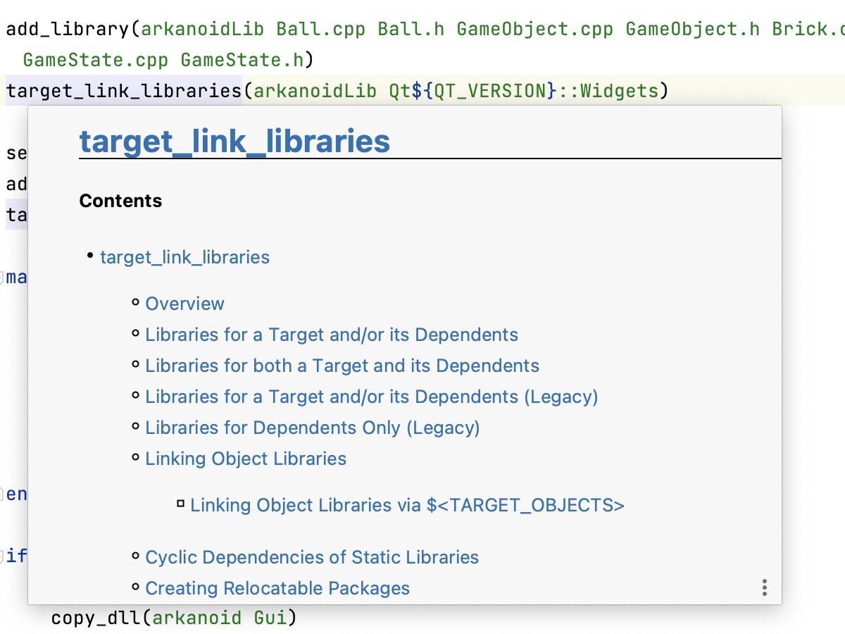 CMake 脚本中现在提供 Quick Documentation(快速文档)弹出窗口。 文档针对标准 CMake 实体显示:
