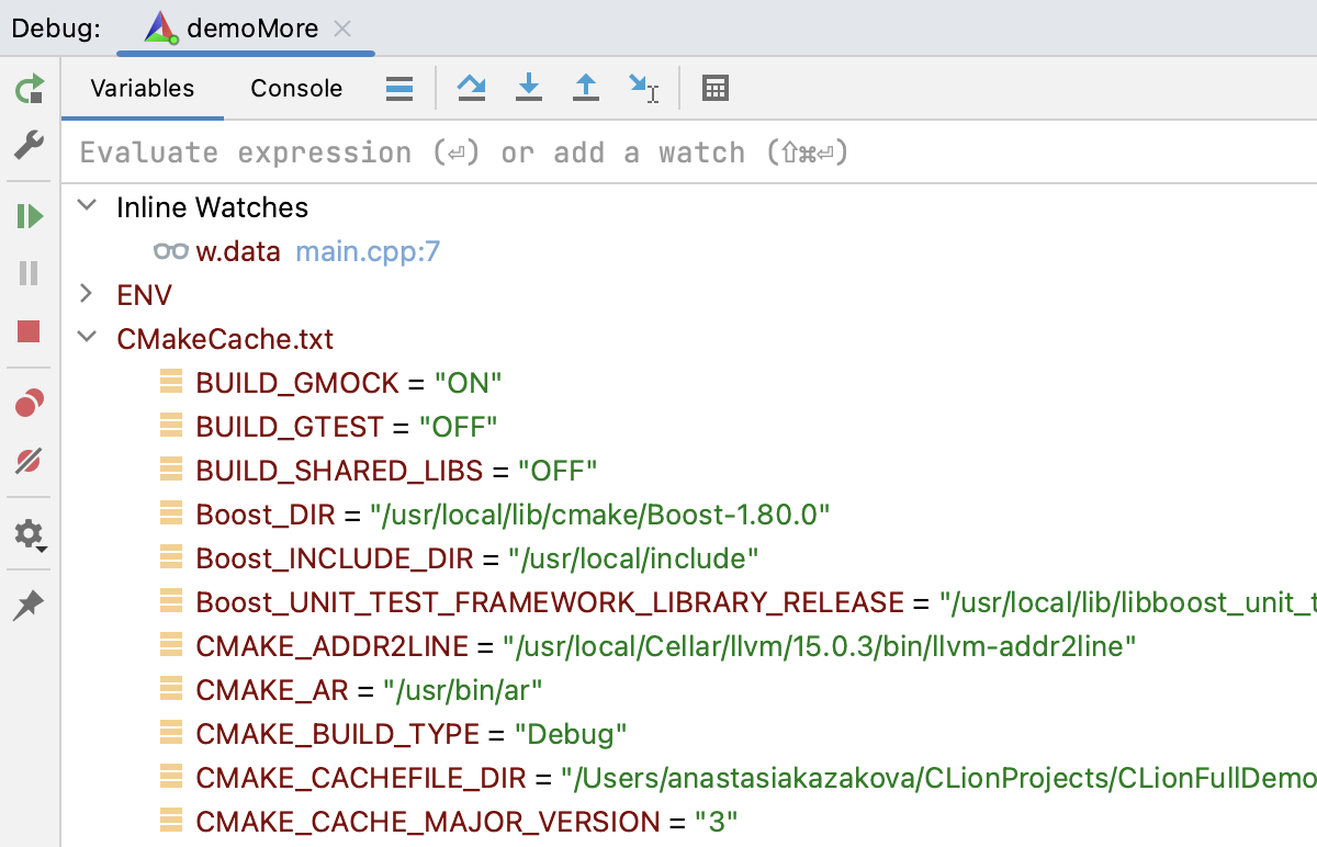 由于 CMake 是一种构建系统的语言,在 CMake 脚本中调查错误和捕获可疑行为有时可能较为困难。 您可以在 CLion 中将 CMake 脚本作为常规代码调试。 设置断点、逐步执行代码并监视 CMake 变量和目标。 了解详情