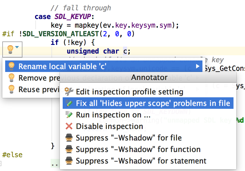 当问题被高亮显示后,请将脱字符号放在它上面,然后按下 Alt+Enter 并从给出的 快速修复方案中选择。 (您也可以点击线段旁发光的灯泡进入 上下文菜单。)