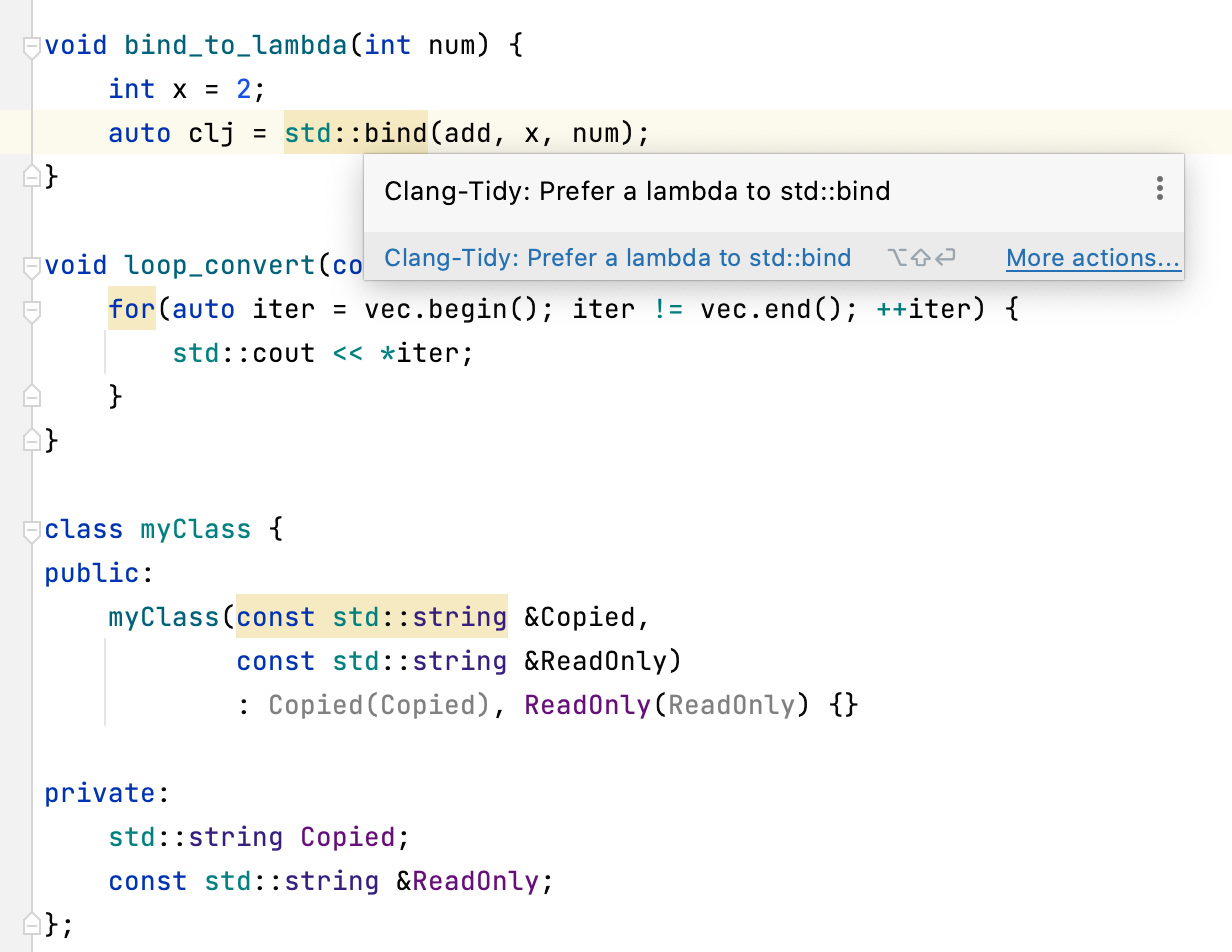 CLion 集成了 Clang-Tidy。 Clang-Tidy 检查的显示方式与 CLion 內建的代码检查显示方式一样,也可以通过 Alt+Enter 应用快速修复。