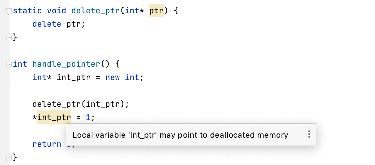 数据流分析 (DFA) 跟踪代码中的数据流,并根据分析结果检测潜在问题。 除了本地 DFA(在单一函数内运作),CLion 还包括全局 DFA(将程序的整个翻译单元作为单一单元进行分析)。 全局 DFA 不仅丰富了现有的检查,还增加了几项独特检查。