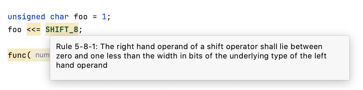 CLion 具有来自 MISRA C 2012 和 MISRA C++ 2008 的检查。 支持检查的完整列表保留于我们的 Confluence 页面,可让您轻松跟踪进度。