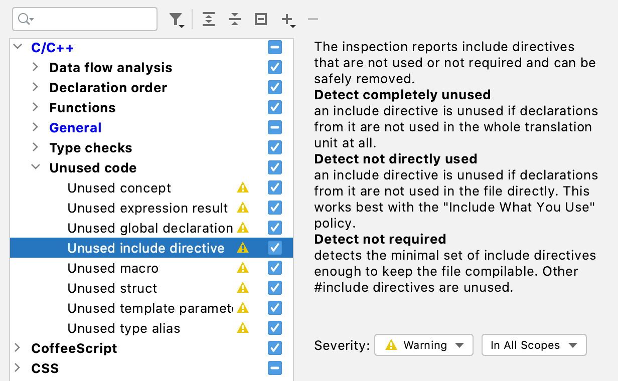 “unused includes”检查会建议 3 种检测策略:保守、积极以及默认 (Detect not directly used),默认策略最接近“Include What You Use”原则。