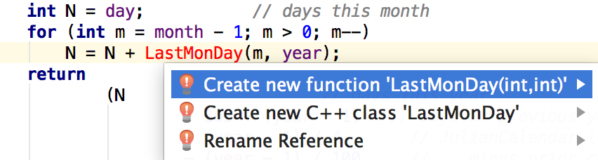 在 CLion 中,您可以在声明前就使用函数、变量、数据成员甚至是类。 IDE 将用红色高亮显示它并给出快速修复建议。 按下 Alt+Enter 来添加 合适的声明。 对于函数,CLion 还可以检测返回类型与其参数 的类型。