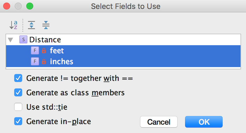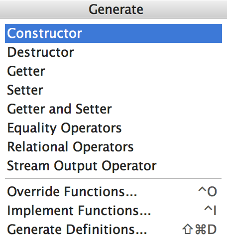 一键即可获取 setters/getters、构造函数/析构函数、相等、相关和流输出运算符。 在生成期间选择要使用的字段,以及生成为类成员和就地生成等各一个选项,使用 std::tie 实施运算符和其他必需的选项。