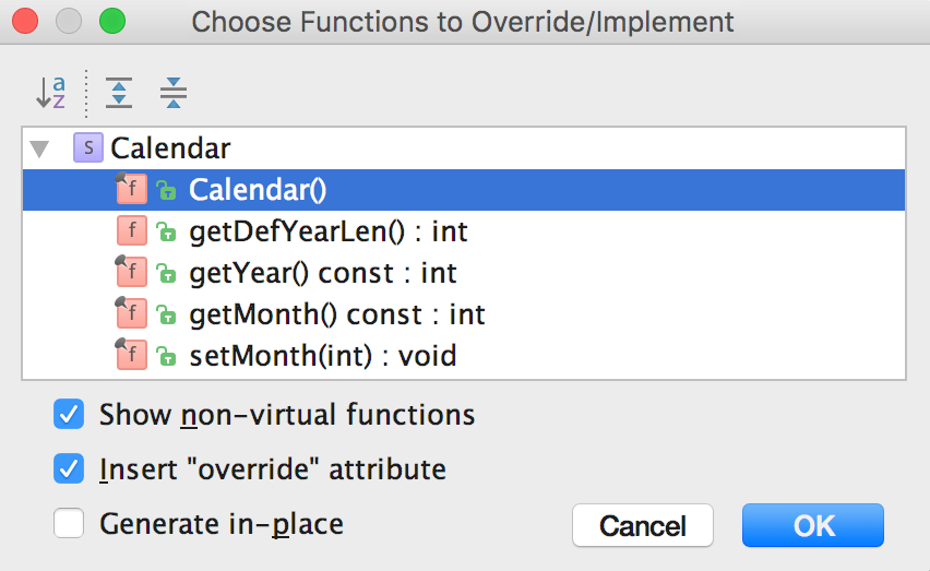 Generate in-place 根据您的代码来设置默认值,因为 CLion 会逐渐适应您在项目中使用的模式,会实施启发来支持最常见的案例(比如 header-only 或 cpp-only 类等等)。