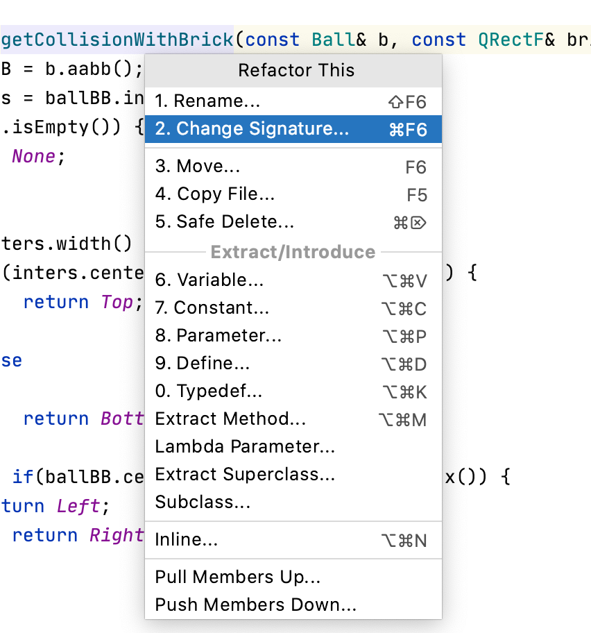 Extract (Function Ctrl+Alt+M, Typedef Ctrl+Alt+K, Variable Ctrl+Alt+V, Parameter Ctrl+Alt+P, Define Ctrl+Alt+D, Constant Ctrl+Alt+C, Lambda Parameter) - 在这里,CLion 可以分析您调用重构的代码块,检测输入和输出变量以及所选表达式的用法,并将其替换为您选择的新创建条目。