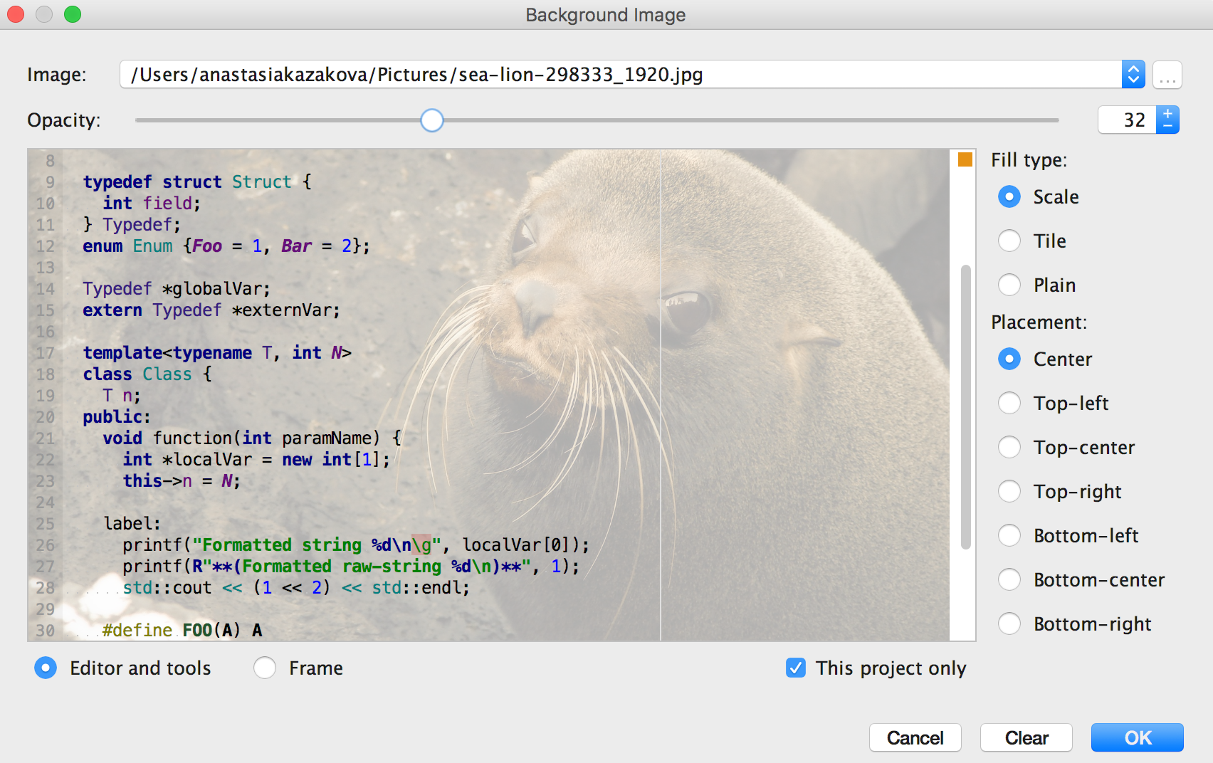 要让您的编辑器更漂亮,请设置自定义背景图像。 打开 Find Action 对话框 (Shift+Ctrl+A),输入 Set Background Image,选择图像,然后在出现的对话框中进行配置。