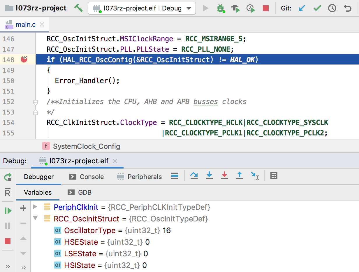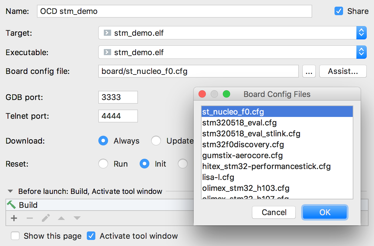 如果可以在 GDB 服务器上调试您选择的微控制器,您则可以通过 CLion 使用特殊的 嵌入式 GDB 服务器(Embedded GDB Server) 运行/调试配置。 它支持 OpenOCD、ST-Link GDB Servers、Segger J-Link GDB Server、QEMU 和很多其他具体的 GDB 服务器。