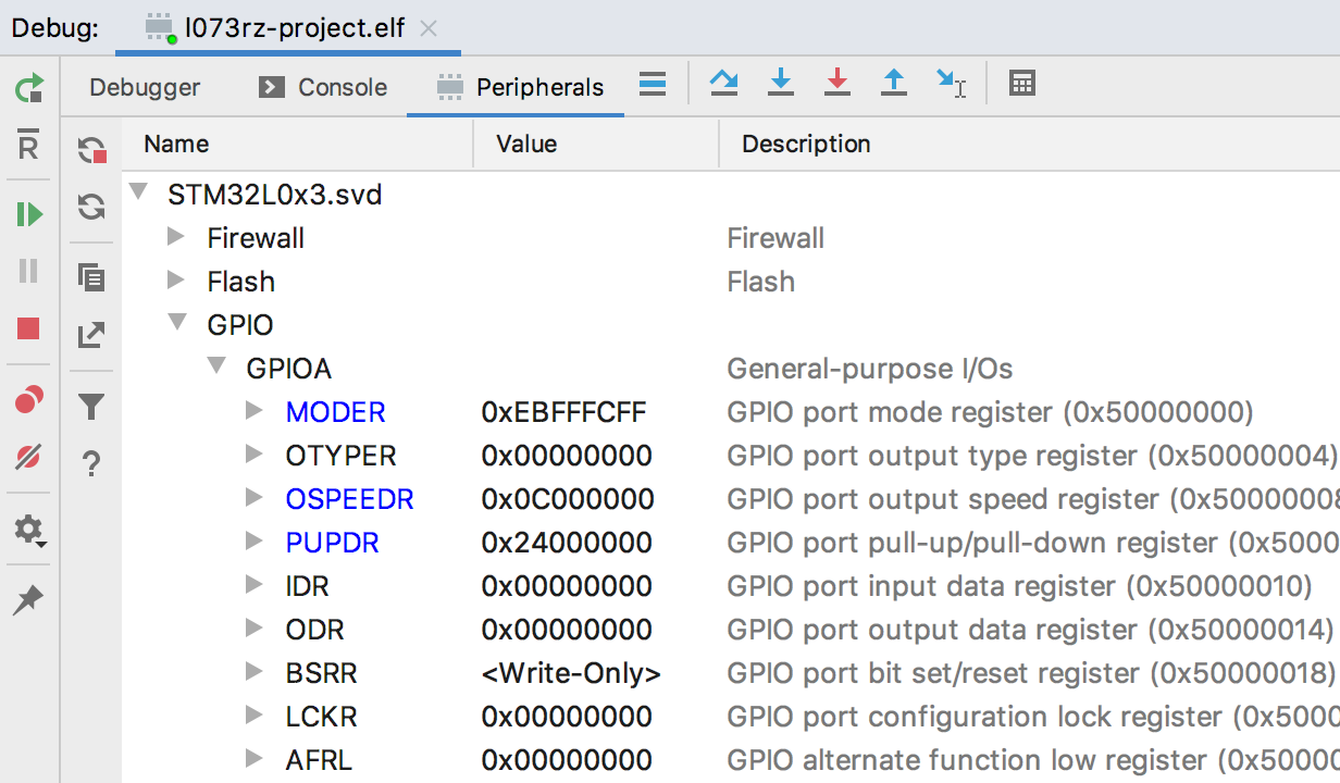 在线调试时,能够查看外设至关重要。 在 CLion 中,该视图现在可用于两类运行/调试配置: 嵌入式 GDB 服务器 (Embedded GDB Server) 和 OpenOCD 下载和运行 (OpenOCD Download & Run)。 在这两种情况下,开始调试时,调试工具窗口中会出现 Peripherals 标签页。 为您的面板选择合适的 .svd 文件,并选择需要查看的有效外设。