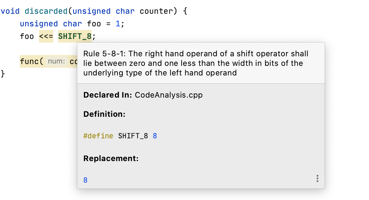 CLion 部分支持 MISRA C:2012、MISRA C++:2008 和 MISRA C++:2023。 这些指导原则广泛应用于嵌入式开发,尤其是汽车行业。 CLion 中的 MISRA 检查可以在开发周期早期发现不一致,加快编码速度。 当前支持的检查列表可以在 CLion 知识库中找到。