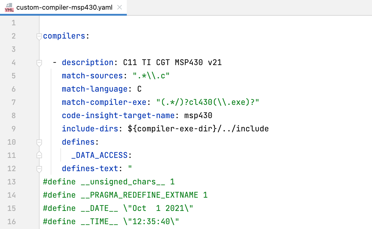 使用 Settings | Build, Execution, Deployment | Toolchains | Custom Defined Compiler(设置 | 构建、执行、部署 | 工具链 | 自定义编译器)启用自定义编译器,并提供包含您的自定义编译器定义的 *.yaml 文件。 请参见 CLion 团队为您准备的示例配置。