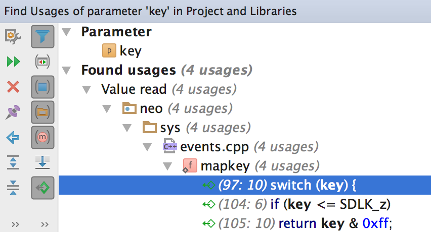 在 CLion 中,您可以轻松在代码中定位任意符号(类、函数、变量、宏等等)的 用法。 要在当前文件中高亮显示符号的所有用法,请按下 Ctrl+Shift+F7 然后 在它们间跳转。 (下一个 - F3,上一个 - Shift+F3)。 此外,使用 Find Usages (Alt+F7) 可以在单独窗口中列出所有用法。 请注意,CLion 能够理解符号上下文:它不会给出文本匹配,而是给出你要搜索的 符号用法。