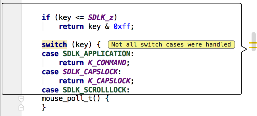 在此模式中,您只需将鼠标悬停在滚动栏中的任意部分就可 以 仔细检查您的代码。 当鼠标悬停在警告或错误栏上时,代码片段上会有 相应的消息注释。