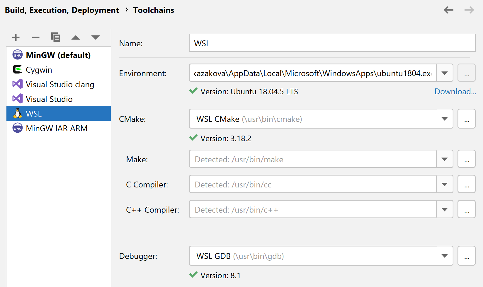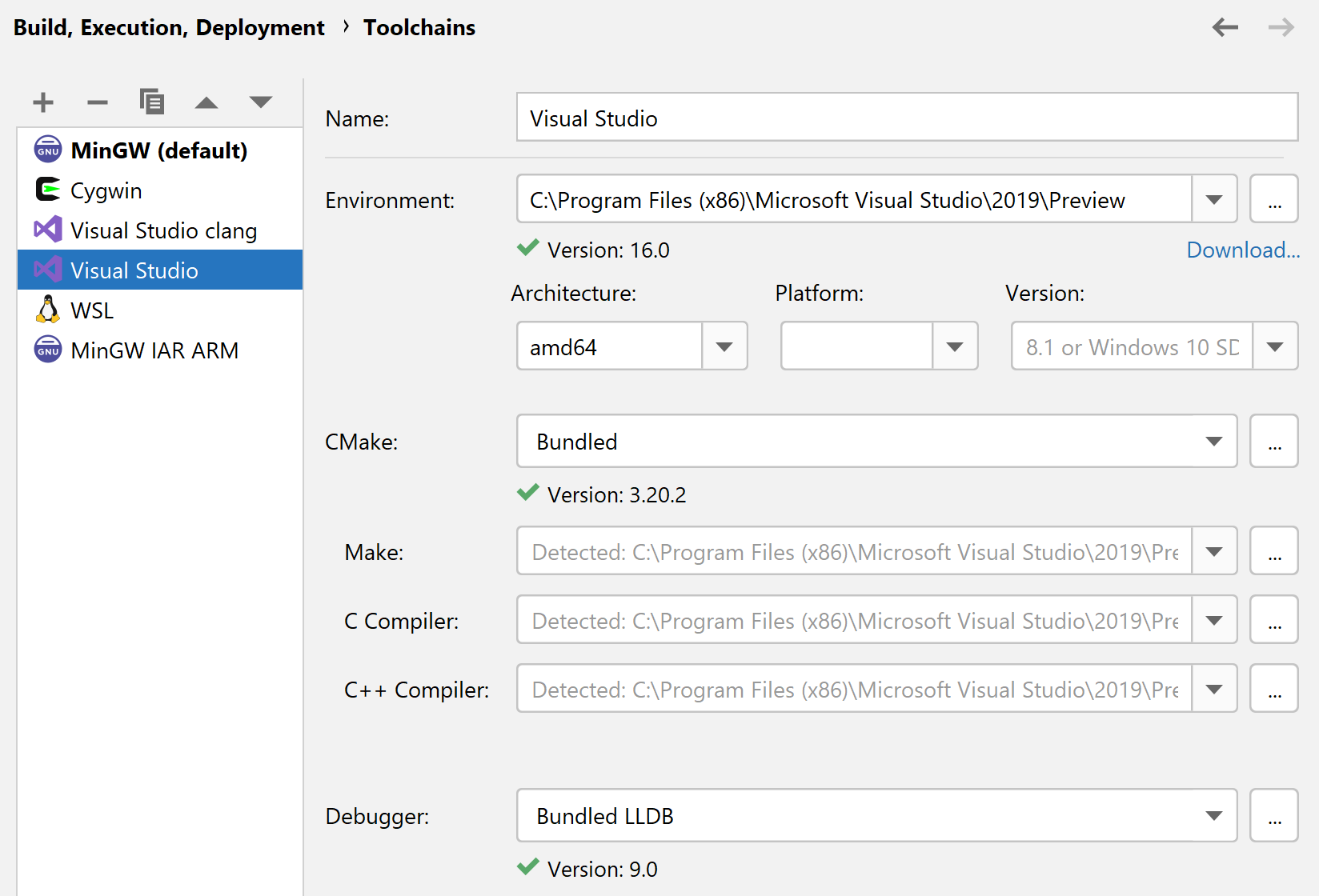 CLion 支持并可以从 Visual Studio 2013、2015、2017 和 2019 自动检测 Microsoft Visual C++ 工具链。