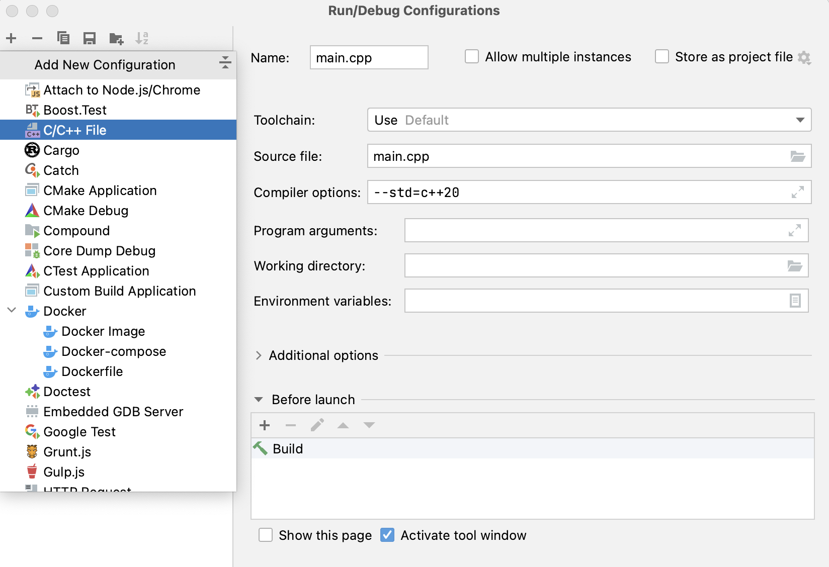 C/C++ File 运行/调试配置类型让您可以快速配置工具链、源文件和编译选项。 创建后,它允许编译和运行所选文件。