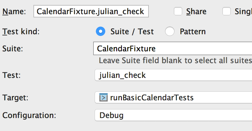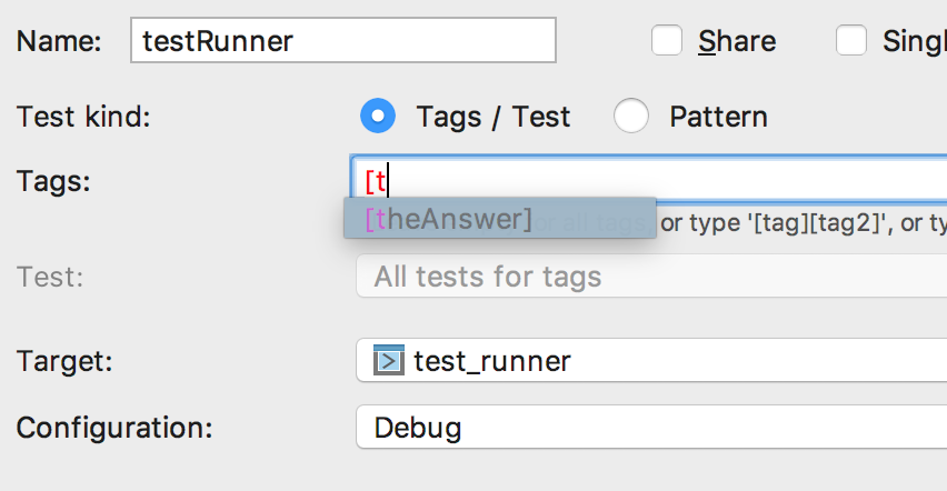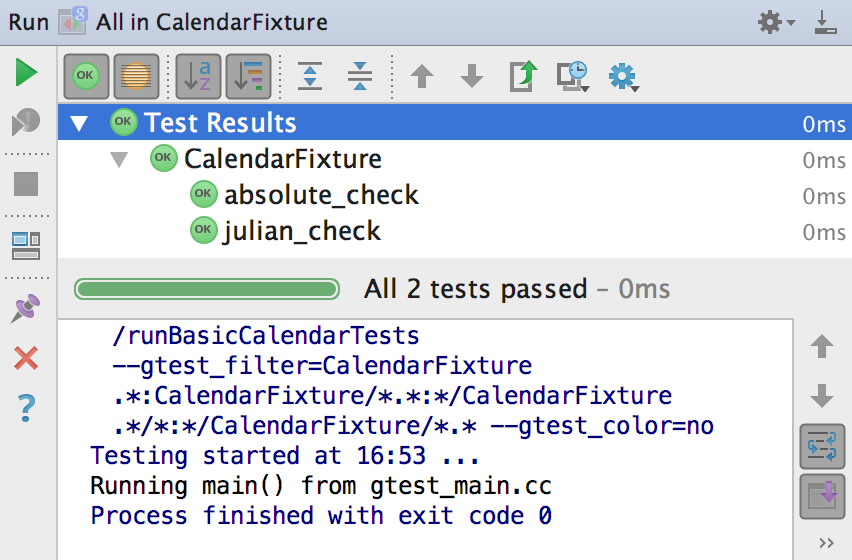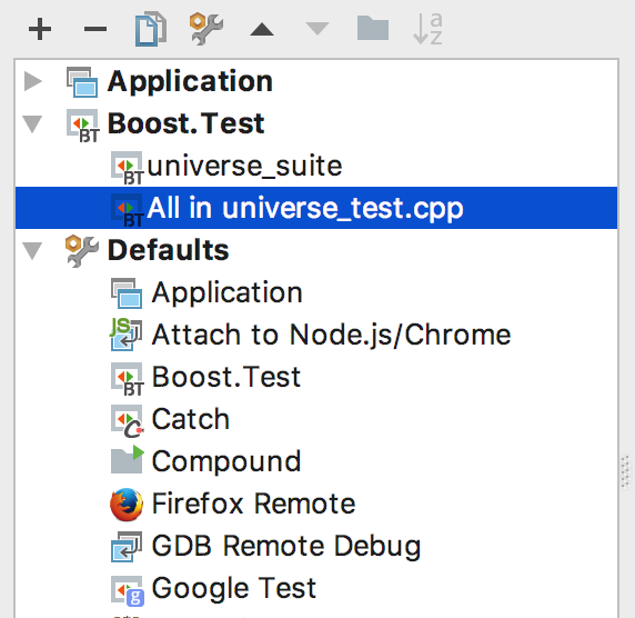 假如您的 CMake 目标已经与 gtest 或 gmock 关联了,那么将自动创建该配置。 或者您也可以按 ⌃⇧R 来运行一个简单测试、固定例程或