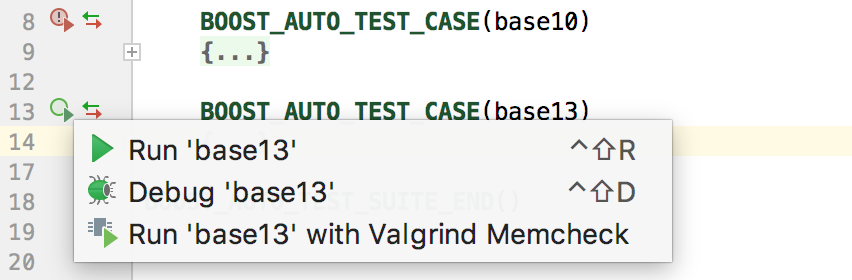左边装订区域中的图标可以让您运行/调试测试,或者使用 Valgrind Memcheck 运行它们,还可以报告测试的状态:成功或失败。