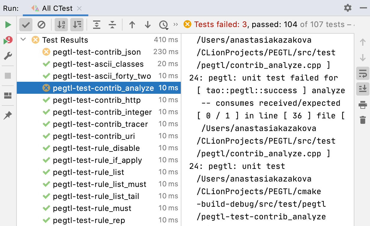 CLion 支持 CMake 特定的测试运行程序 CTest。 这意味着将检测到使用 CTest 运行的测试列表,并且 IDE 会自动为它们创建运行/调试配置。 启动测试时,结果将呈现在内置测试运行程序中,您可以在其中调试测试,仅重新运行失败的测试等。