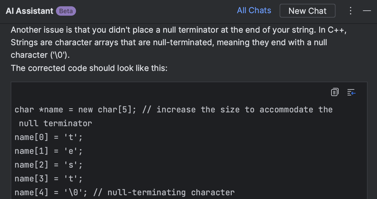 AI Assistant 侧重于编程话题,并在项目特定的上下文中提供帮助。 在新的专属工具窗口中迭代,对结果感到满意后,您可以使用 Insert Snippet at Caret(在文本光标处插入代码段)功能或手动复制,将 AI 生成的代码放入编辑器。