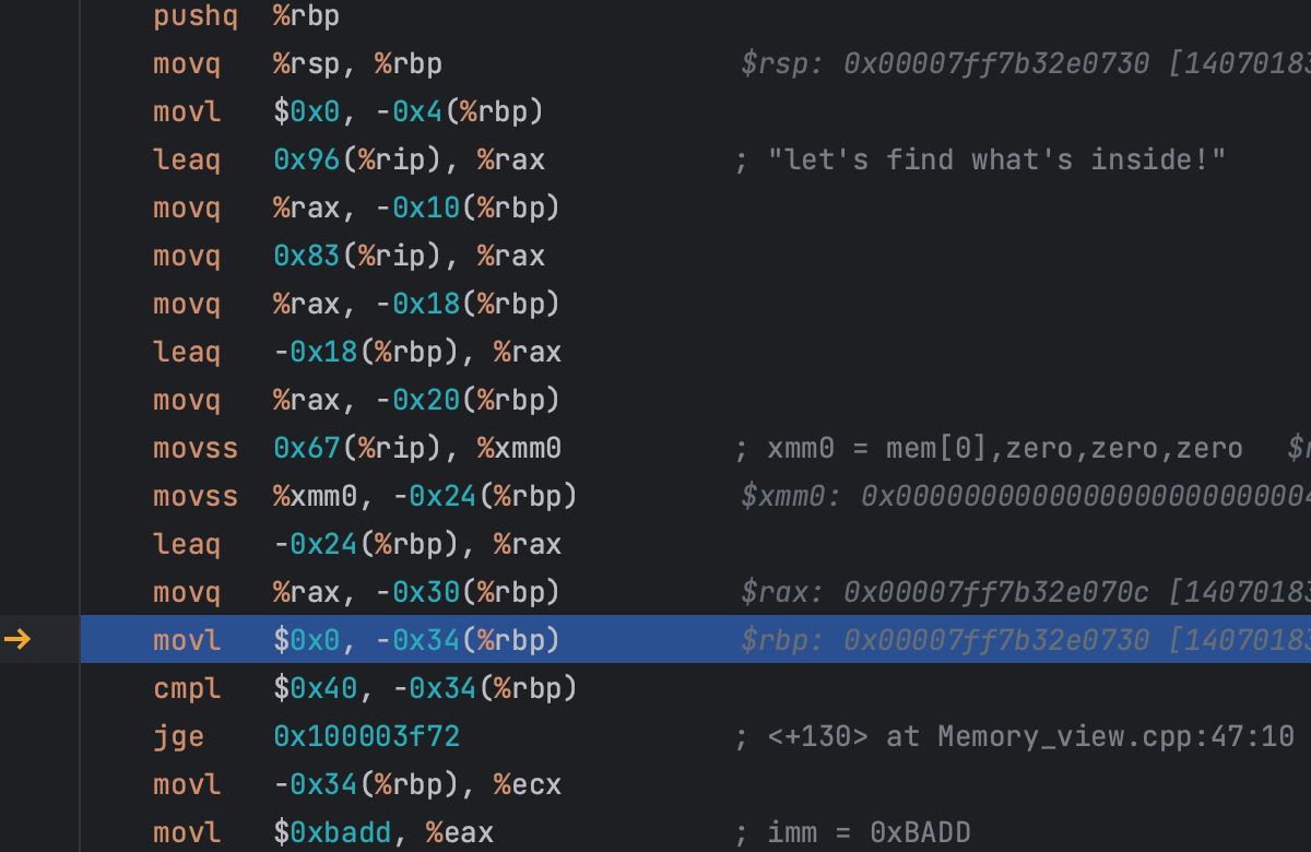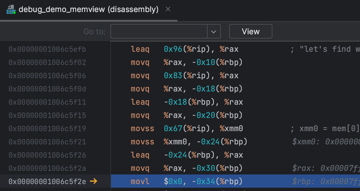 调试反汇编代码时,CLion 现在将直接在反汇编视图中显示内联的寄存器值。