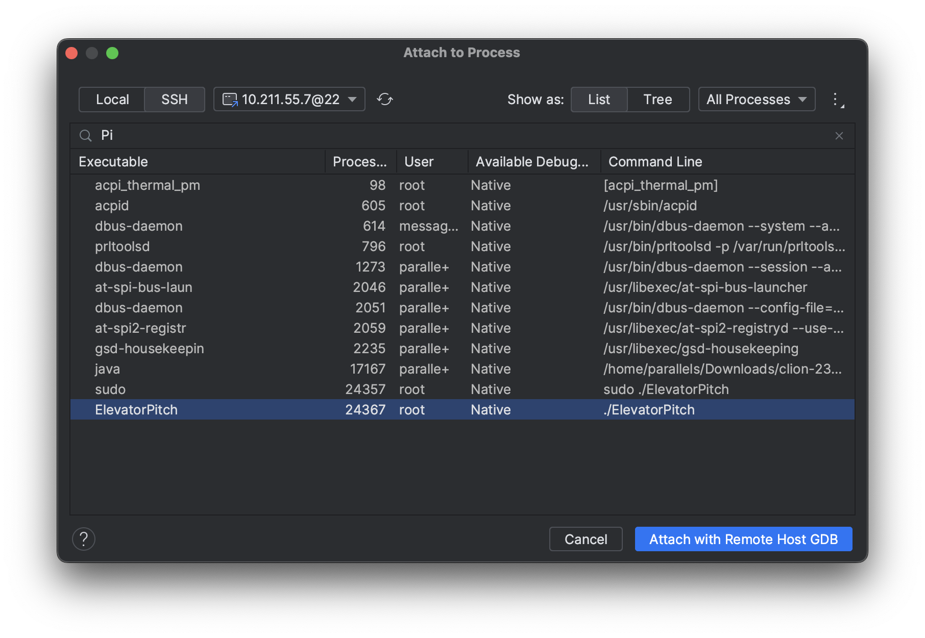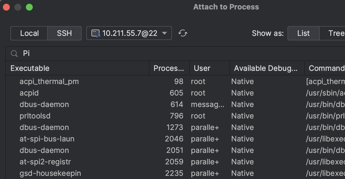 Attach to Process(附加到进程)对话框既可以让用户在本地或远程调试在 CLion 以外启动的进程,还可以让用户从 IDE 的调试器集成中受益。