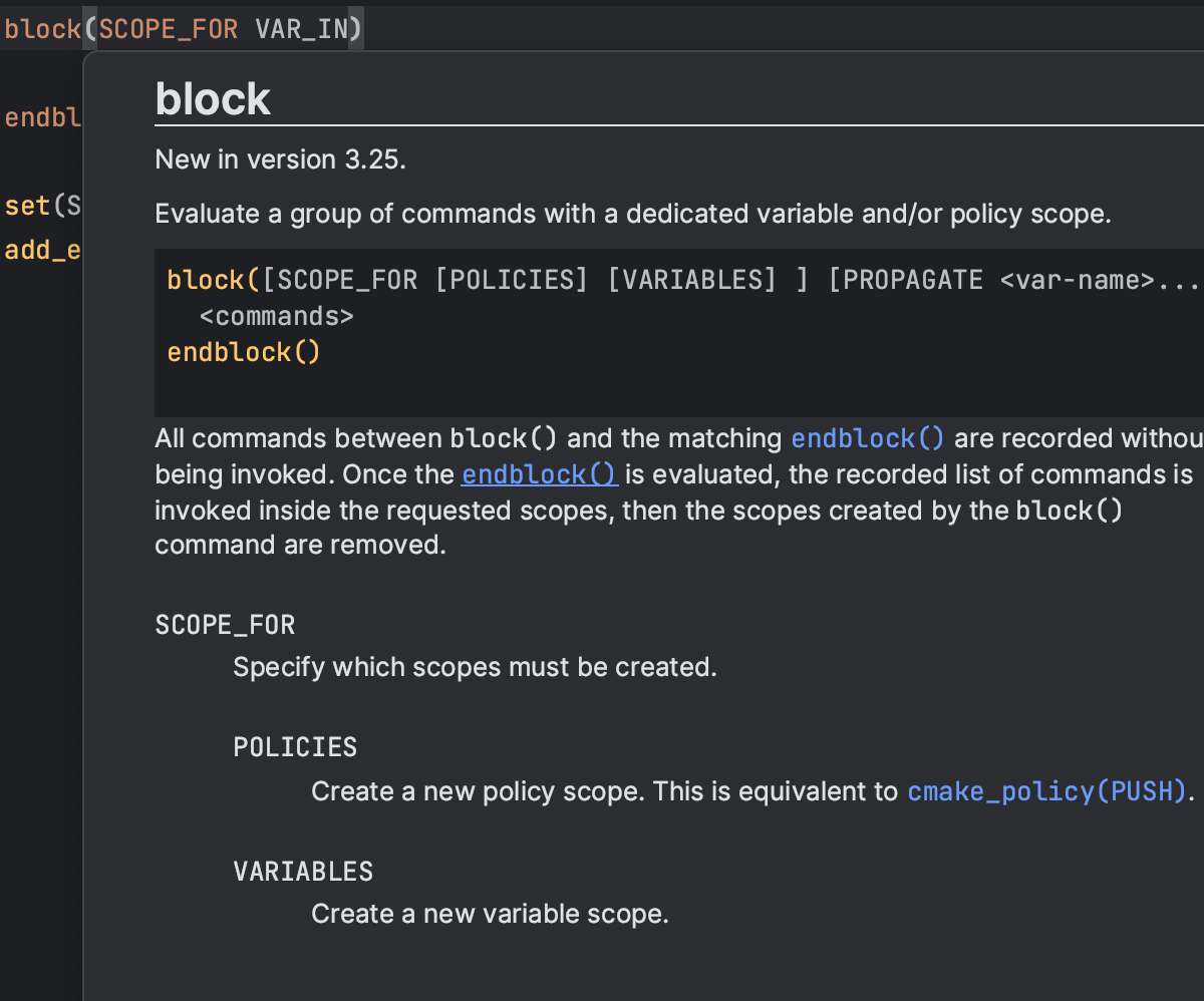 CLion 2023.2 为 CMake 3.25 的新形参以及用于在请求作用域内执行一组命令的新块命令增加了高亮显示和补全。 在 CLion 中,新命令现在可以正确高亮显示、格式化、折叠和记录。