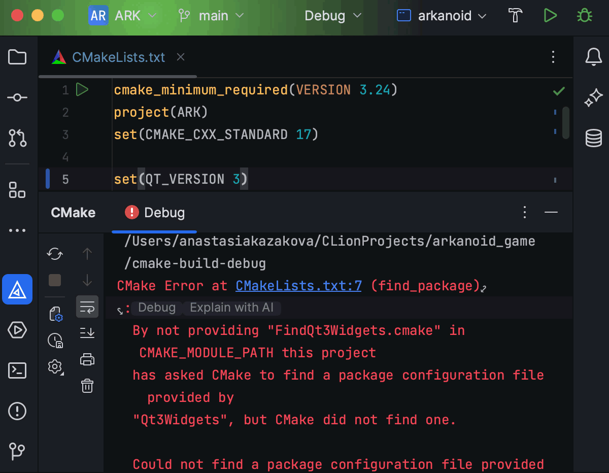 当 CMake 执行在项目上失败时,点击 CMake 工具窗口中的 Explain with AI(使用 AI 解释)即可更好地了解出现的问题以及修正方法。