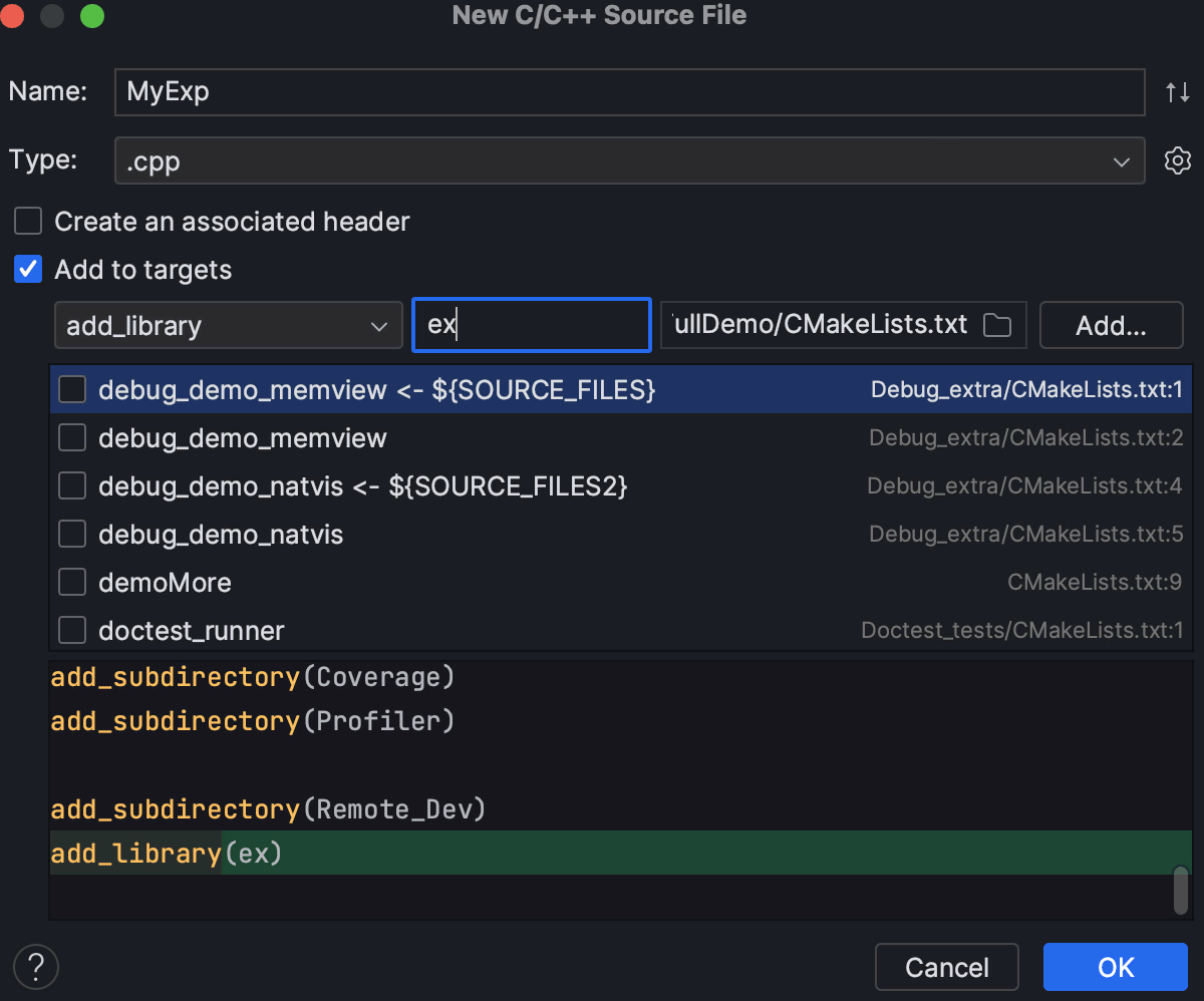 CLion 2023.2 改进了 C/C++ 文件新建对话框,以防没有可添加新文件的 CMake 目标。 新的 Add new target...(添加新目标…)操作会创建新目标并将其添加到所选 CMakeLists.txt 文件中。 添加目标后,您可以向其中添加新文件。