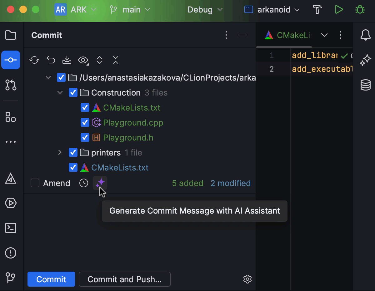 CLion 2023.2 将 AI Assistant 功能自然引入一些核心 IDE 用户工作流。 在 C 和 C++ 中,它可以解释所选代码,建议如何更好地重构代码段,或者找出潜在问题。 它还可以生成提交消息并解释 CMake 错误。