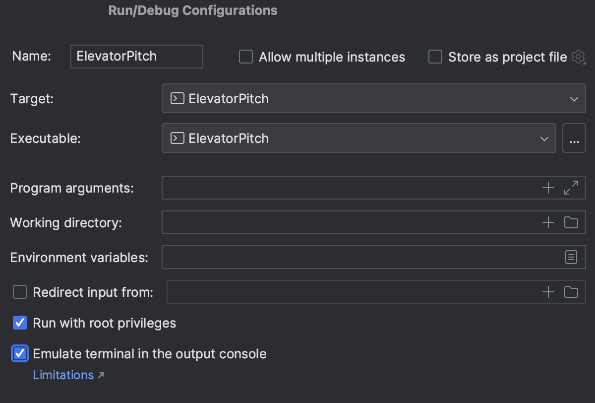 输出控制台中的终端仿真现在可以针对每个配置分别启用或禁用。 它默认处于禁用状态,并且控制设置已从 Advanced Settings(高级设置)移动到 Run Configuration(运行配置)部分。