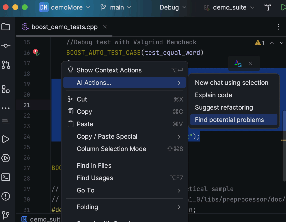 在编辑器中选择特定代码段,然后从 AI Actions…(AI 操作…)上下文菜单调用操作。