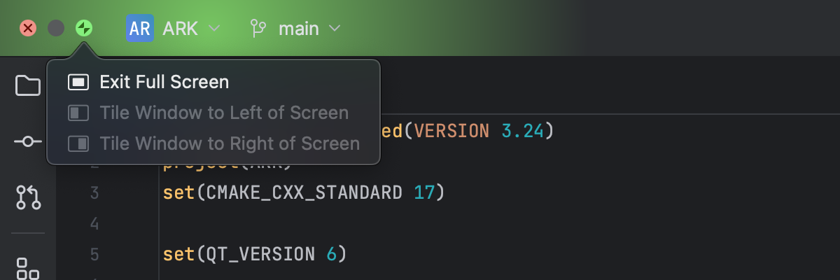 在 macOS 上以全屏模式使用新 UI 时,窗口控件将直接在主工具栏中显示,而不是像以前一样在浮动栏中显示。