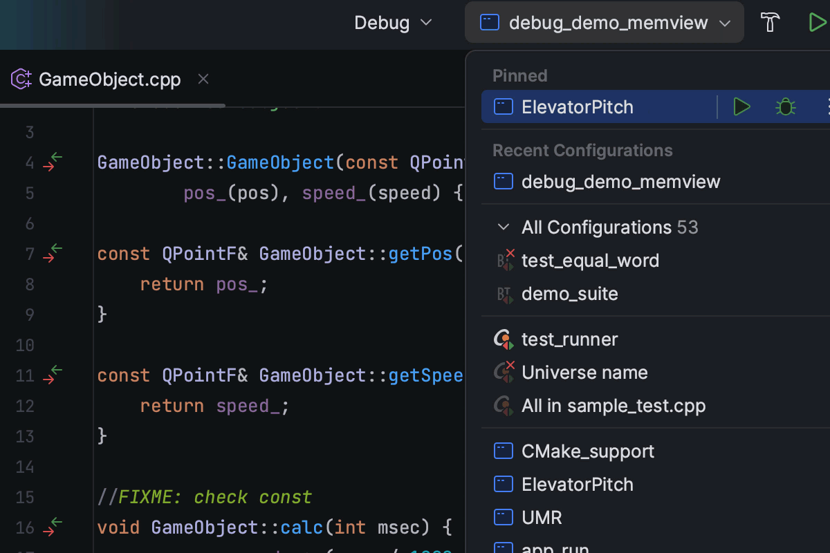 为了简化多个运行配置的管理,我们在 Run(运行)微件中实现了固定首选配置的选项。