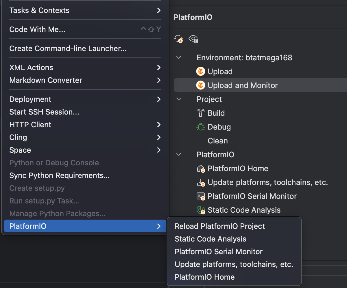 一些 pio 命令现在可以直接从 IDE 中调用(Tools | PlatformIO(工具 | PlatformIO))– 无需切换到终端。 其中包括项目重新加载、在项目上运行静态代码分析、调用设备监视器等。