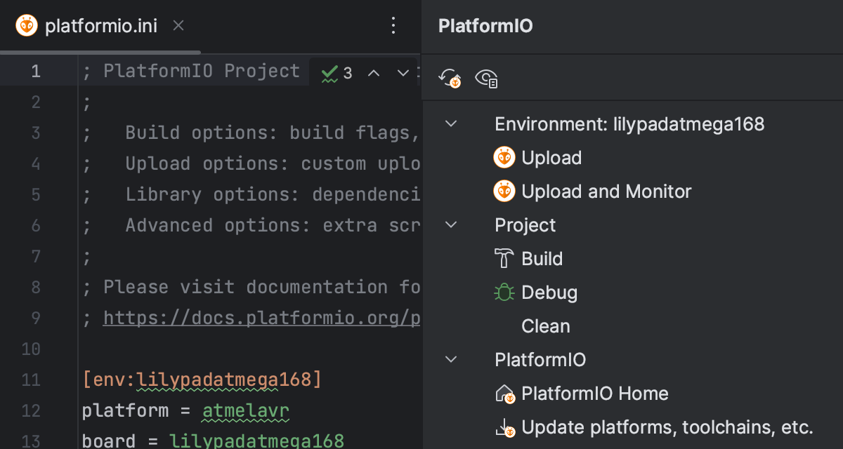 PlatformIO 是一个开源平台,用于帮助嵌入式开发者处理其项目。 CLion 2023.2 与该平台原生集成。 IDE 直接使用 platformio.ini 文件,跟踪其中的更改并相应地更新项目信息。