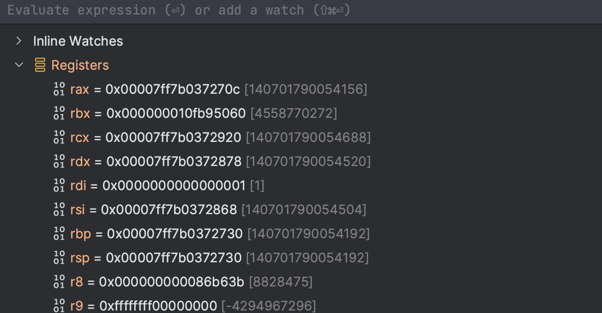 能够检查当前帧的寄存器时,低级调试会更加轻松。 CLion 现在会在调试器工具窗口的 Variables(变量)标签页中显示寄存器值。