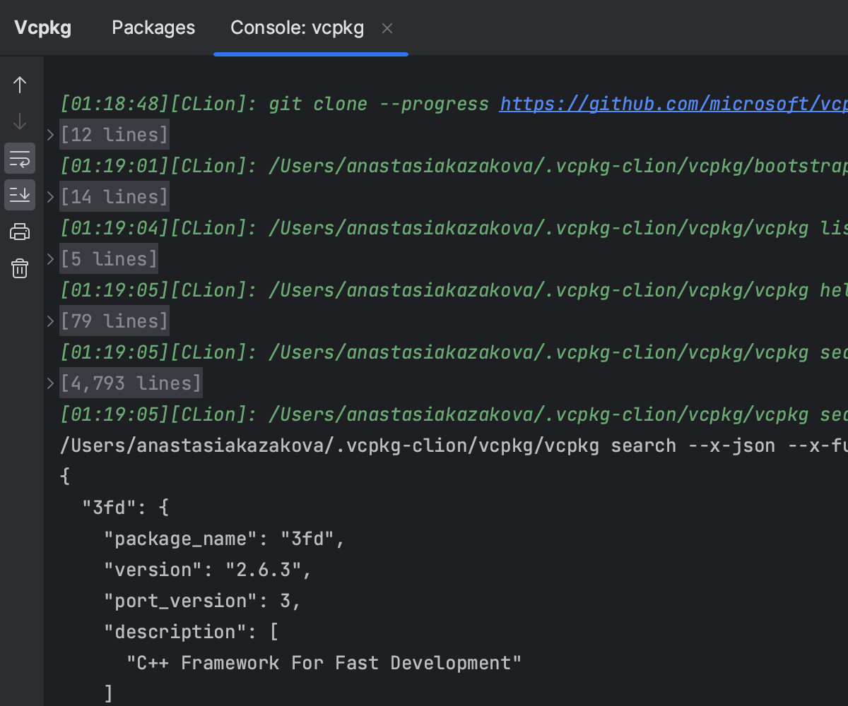 为了使 vcpkg 经典模式更加方便,vcpkg 工具窗口中新增了 Console(控制台)标签页,显示所有命令和输出。