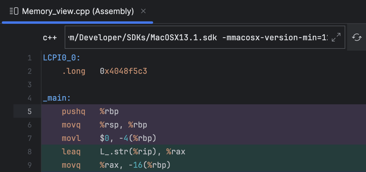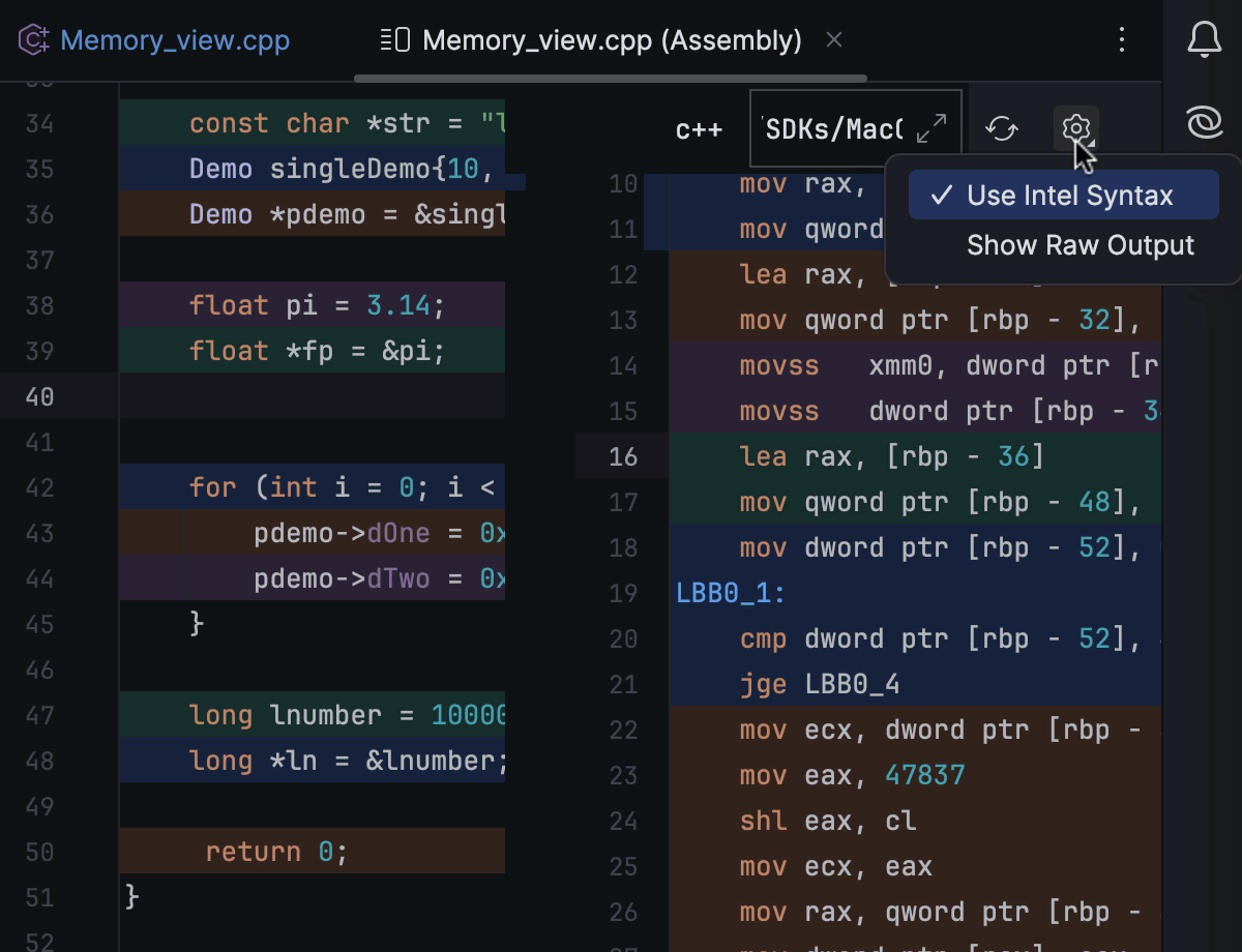 CLion 中的所有 Assembly(程序集)视图(有或没有调试会话)均已增强,能够切换到 x86 程序集 (Intel) 语法。 为此,请转到 Assembly(程序集)视图窗口中的 Options(选项)并刷新视图以应用更改。