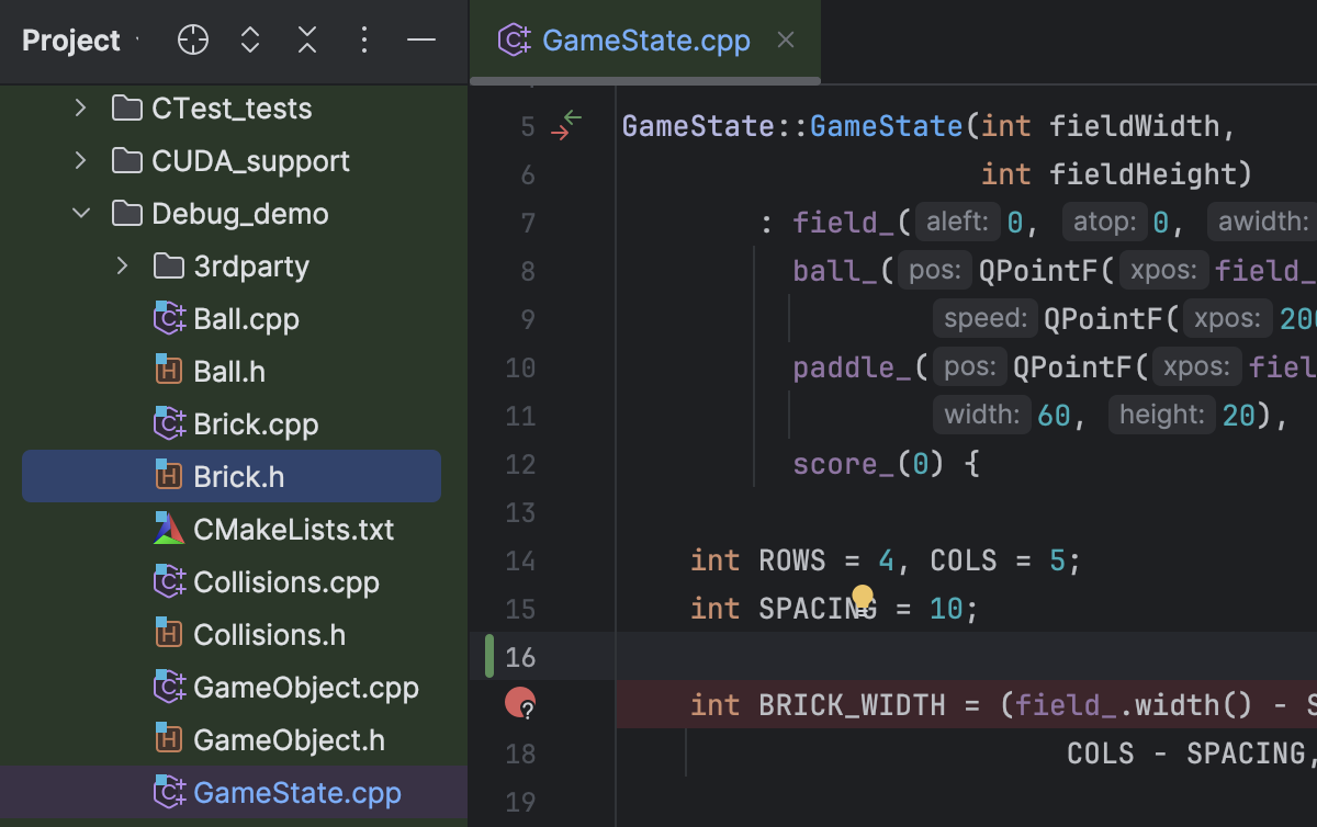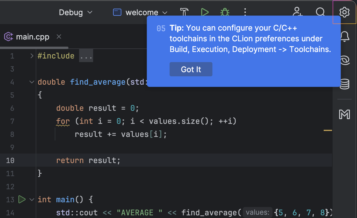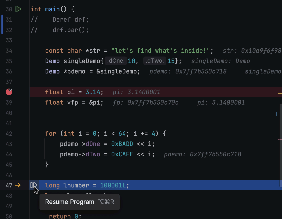 CLion 2023.3 在新 UI 中引入了新的 Run to Cursor(运行到光标)嵌入选项,提供了在调试时快速导航到特定代码行的方式。 程序挂起后,您可以将鼠标悬停在要执行程序的代码行上,点击 Run to Cursor(运行到光标)弹出窗口来执行代码,直至到达您在弹出窗口中点击的行。