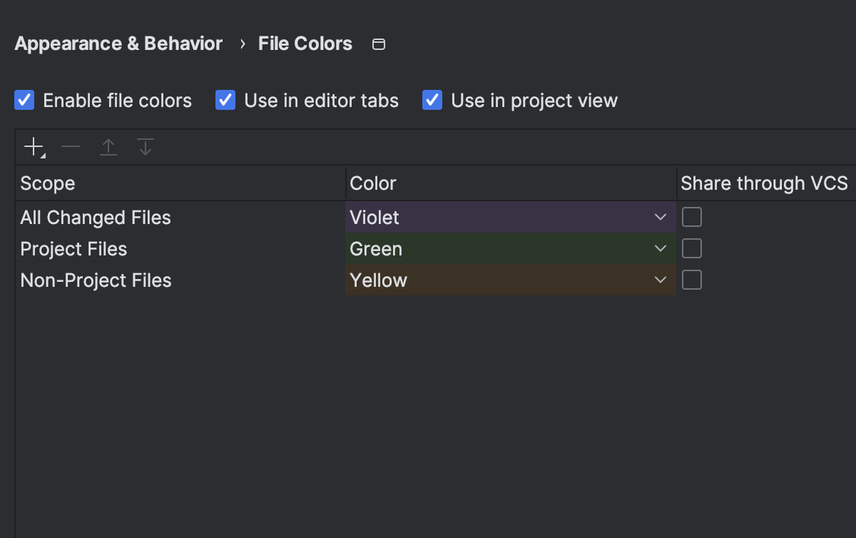 为了增强您在编辑器中同时处理多种文件类型的导航体验,我们为编辑器标签页引入了默认颜色编码高亮显示,反映它们在 Project(项目)工具窗口中的外观。