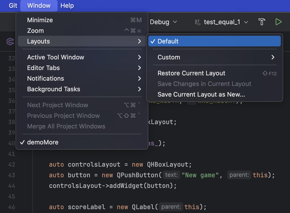 如果您想快速将 CLion 的自定义工具窗口布局还原为默认布局,现在可以使用 Window | Layouts | Default(窗口 | 布局 | 默认)将工作区外观还原为默认状态。