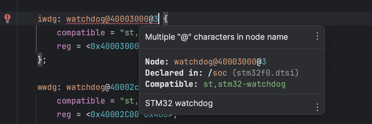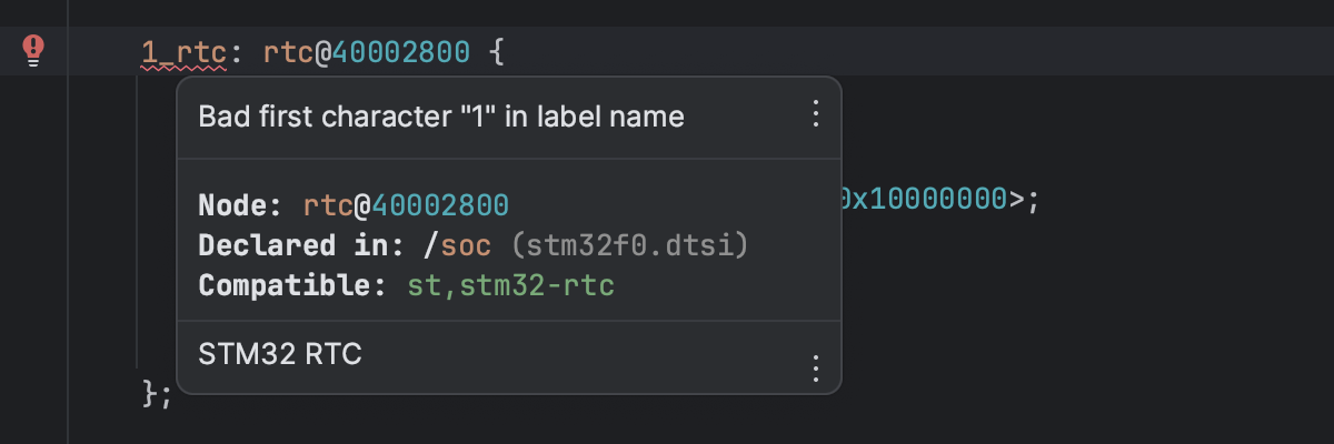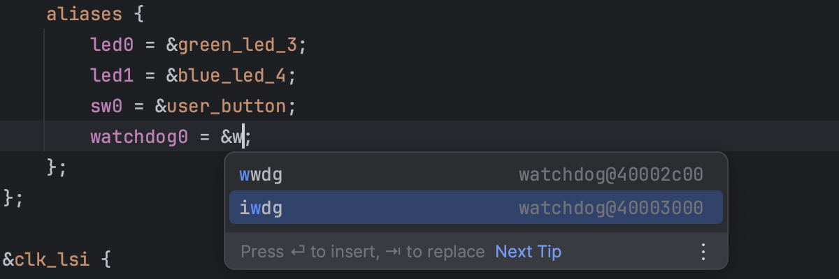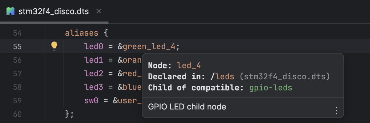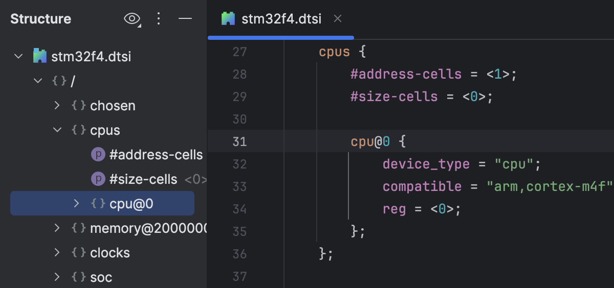 为了帮助您微调硬件,CLion 支持设备树文件。 带有 .dts 和 .dtsi 扩展名的文件被 IDE 视为设备树文件,因此设备树中现在提供了针对相关文件的编码辅助选项。 请查阅在线文档了解详细信息。