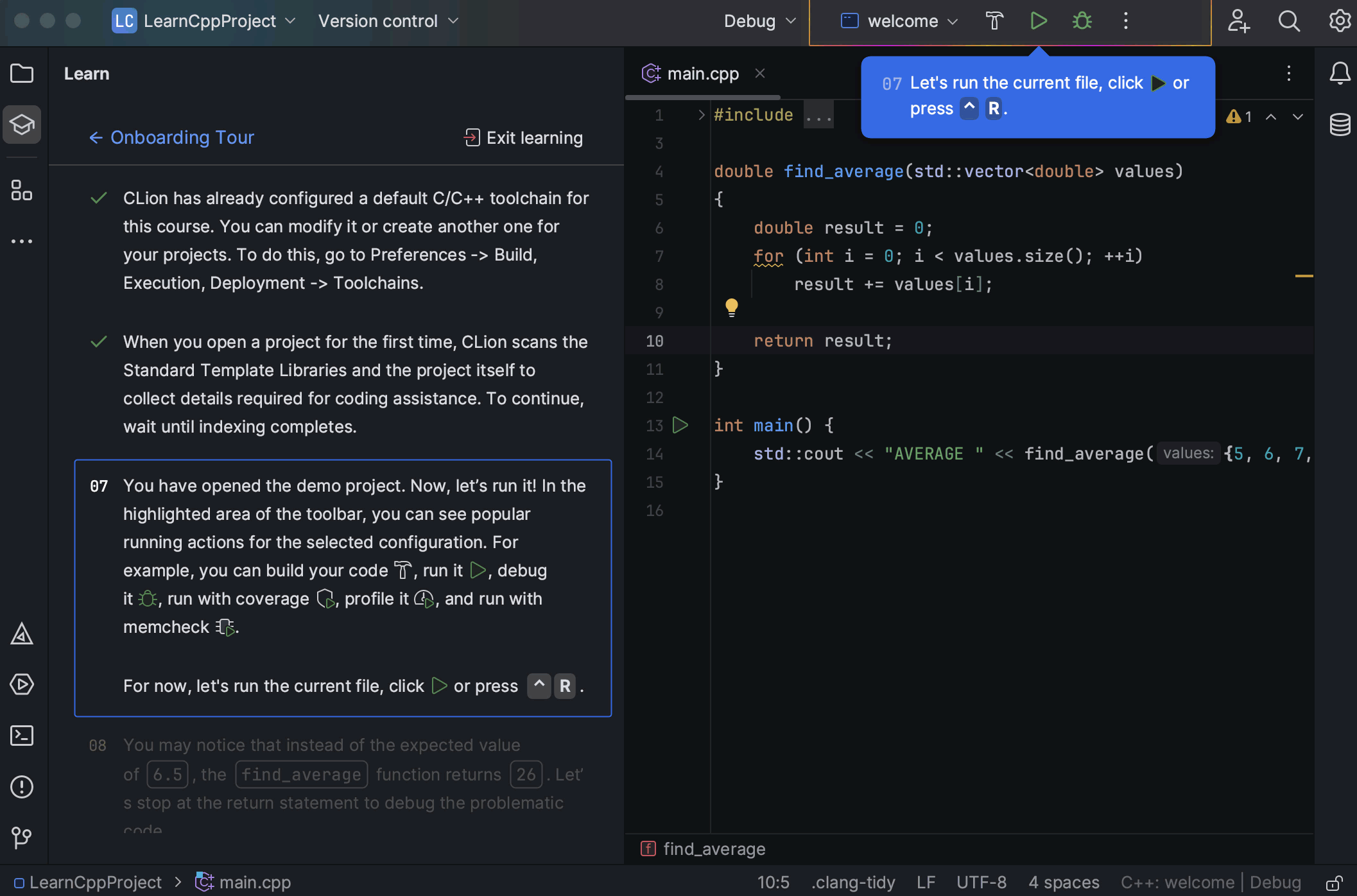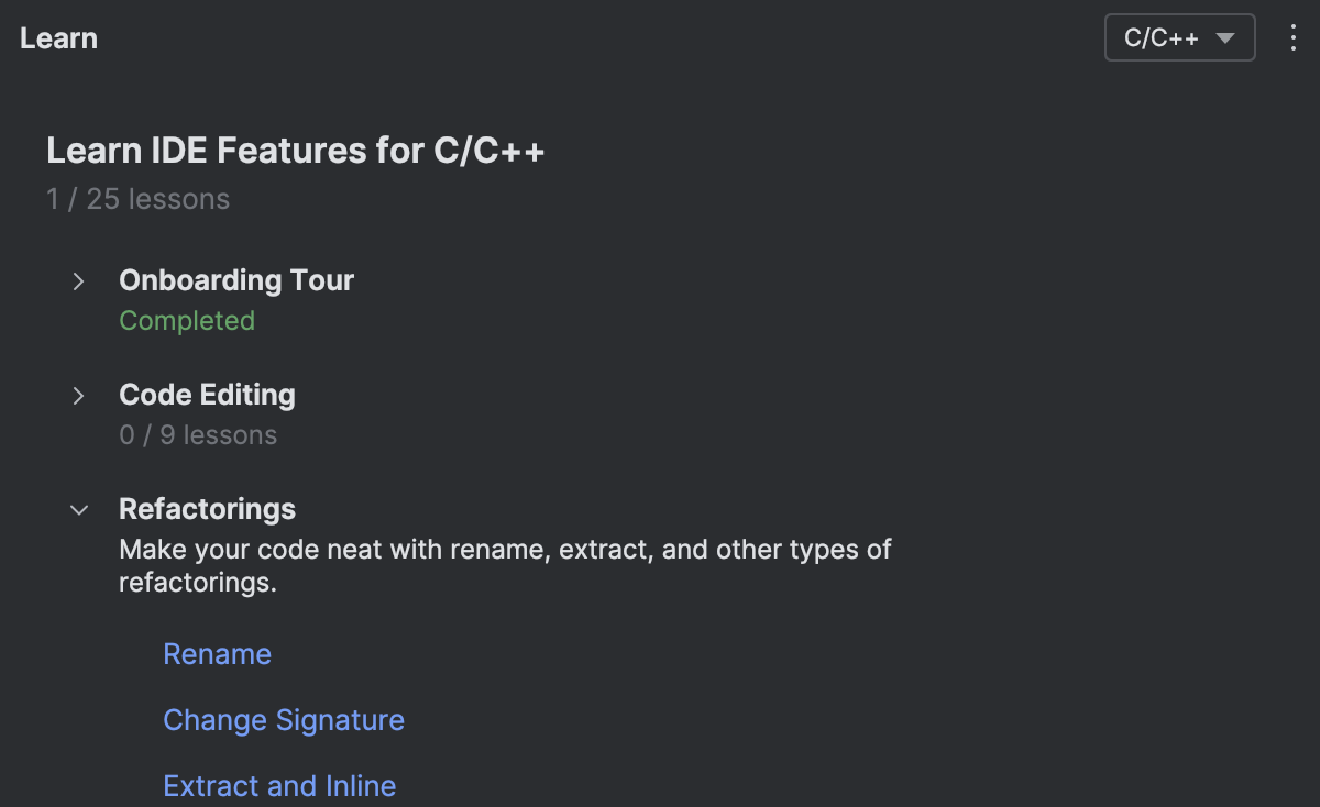 IDE Features Trainer 是一组涵盖基础 IDE 功能的交互式教程。 可从欢迎屏幕或 Help | Learn IDE Features(帮助 | 学习 IDE 功能)启动。 在我们的在线文档中了解详情。