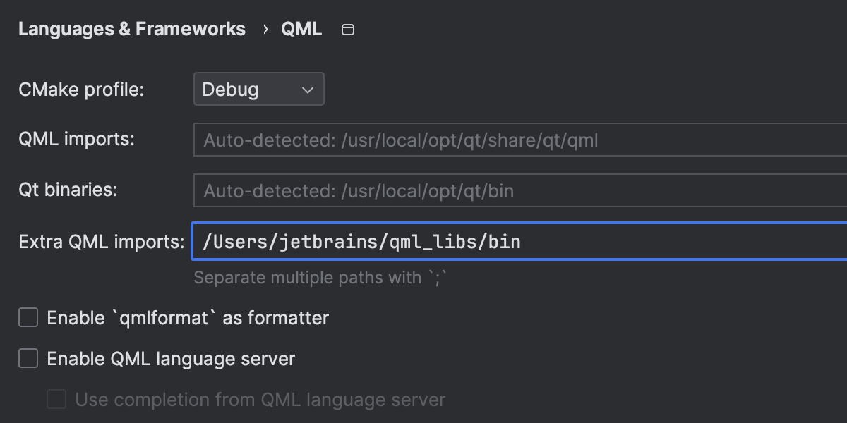CLion 会检测项目中的 QML 类型,以进行解析并提供编码辅助。 但是库 QML 类型或来自用户插件的类型通常位于其他位置。 为了解决这个问题,我们在 Settings/Preferences | Languages & Frameworks | QML(设置/偏好设置 | 语言和框架 | QML)中引入了新的 Extra QML imports(额外 QML import)设置,允许 IDE 在指定位置搜索 QML import 并解析用户代码中的类型。