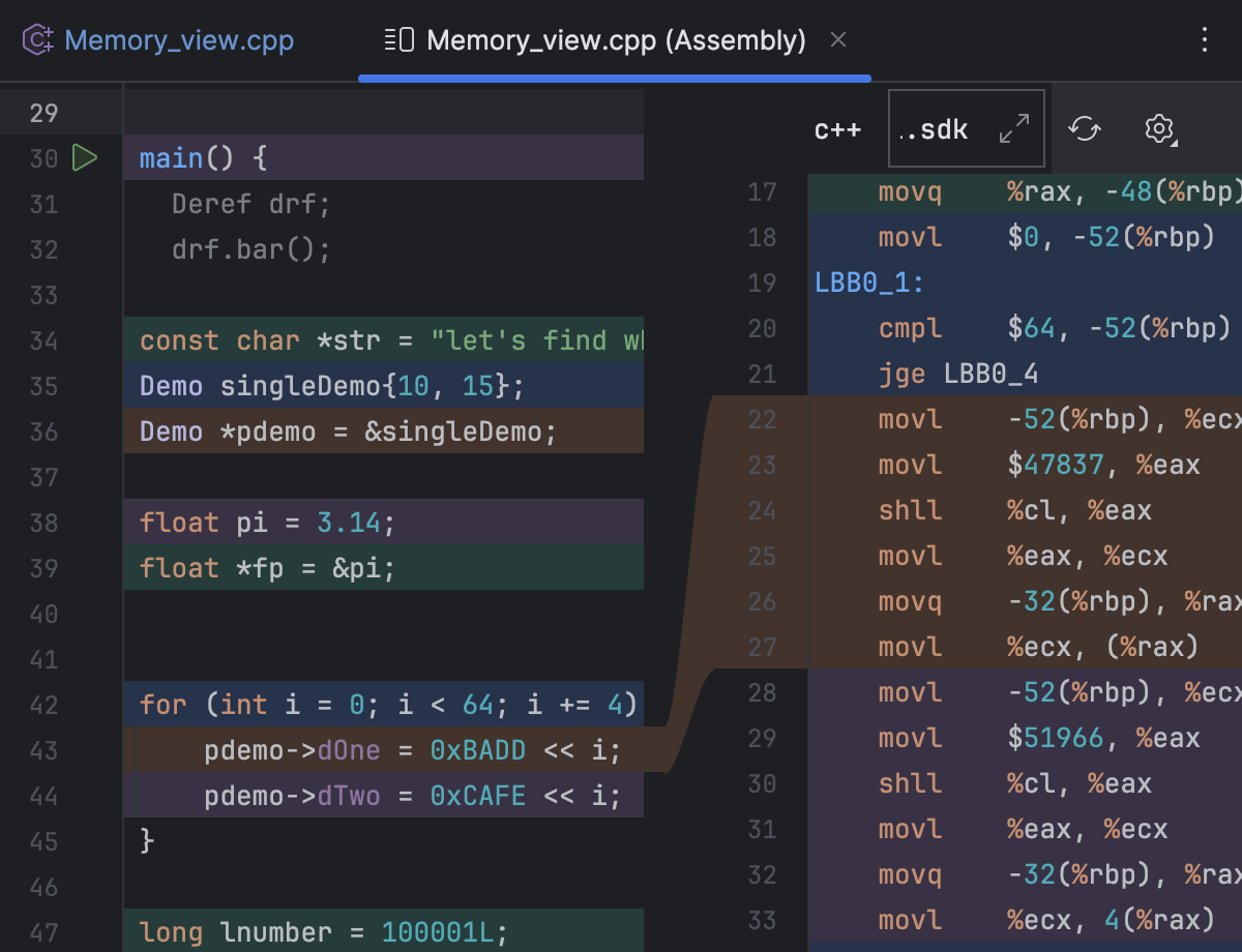 在 CLion 2023.3 中,您不需要调试会话来探索底层程序集代码! 新的 Show Assembly(显示程序集)操作使用当前所选解析配置中的编译器设置,将当前查看的 C/C++ 文件的代码编译为程序集,并打开一个编辑器,其中的预览会显示哪个源代码生成哪个程序集。