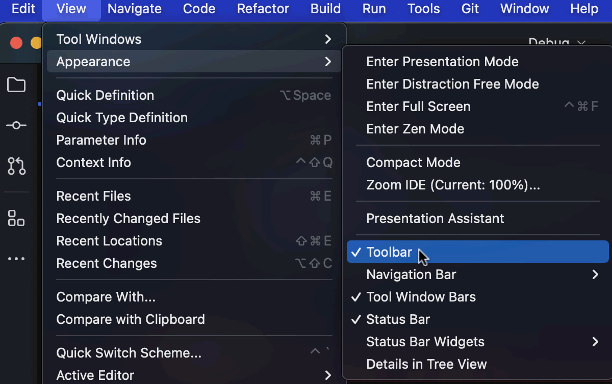 如果您喜欢更紧凑的 IDE 视图,可以使用新选项在默认查看模式中隐藏主工具栏。 转到 View | Appearance(视图 | 外观),取消选中 Toolbar(工具栏)选项以将其隐藏。