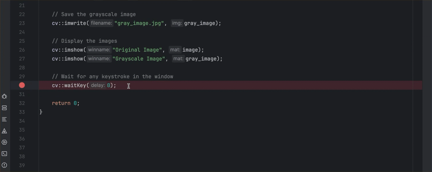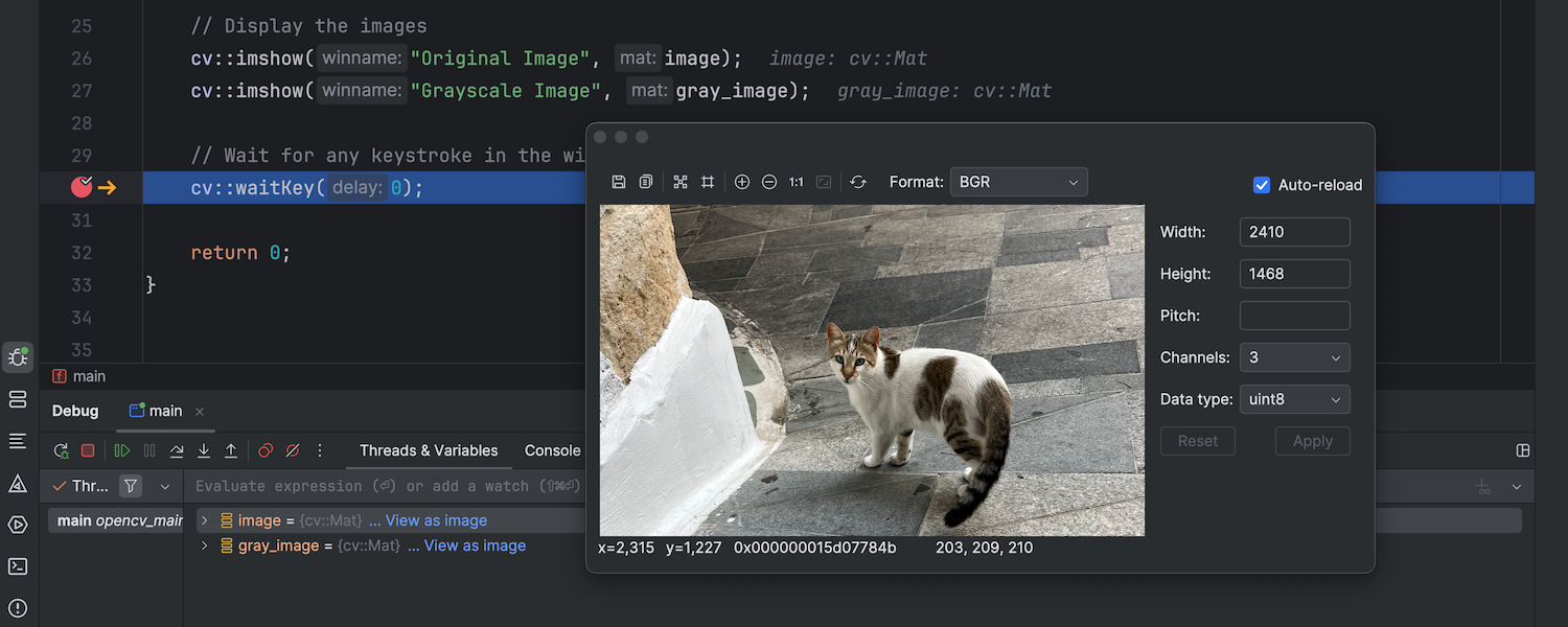 如果您在调试使用 OpenCV 的计算机视觉或 ML 应用程序,您现在能够以图像形式查看二维 OpenCV 数组。 调试器会在单独的对话框中显示这些图像,并提供多种编辑选项和功能,例如在步进时更新图像。