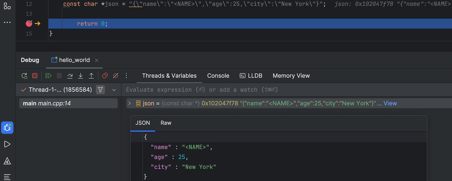调试存储换行符或 JSON、XML 和 HTML 数据的字符串时,您可以直接在调试器中查看根据其代码样式设置格式的字符串。 按变量旁边的 View(视图),您将能够在单独的窗口中查看结构化或原始数据。